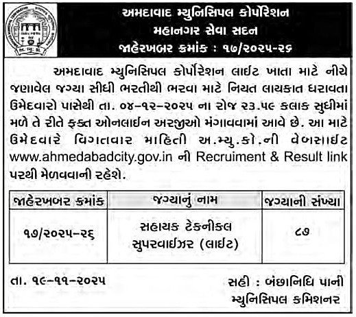 Ahmedabad Municipal Corporation (AMC) Assistant Technical Supervisor Recruitment 2025 Apply Online for 87 Posts AMC Assistant Technical Supervisor Recruitment 2025 Notification PDF, Apply Online Link:• Organization: Ahmedabad Municipal Corporation (AMC)• Advt No.: 17/2025-26• Posts Name: Assistant Technical Supervisor / Sahayak Technical Supervisor (Light)• Total Vacancies: 87 Posts• Category: Latest Jobs• Mode of Application: Online• Online Application … Read more