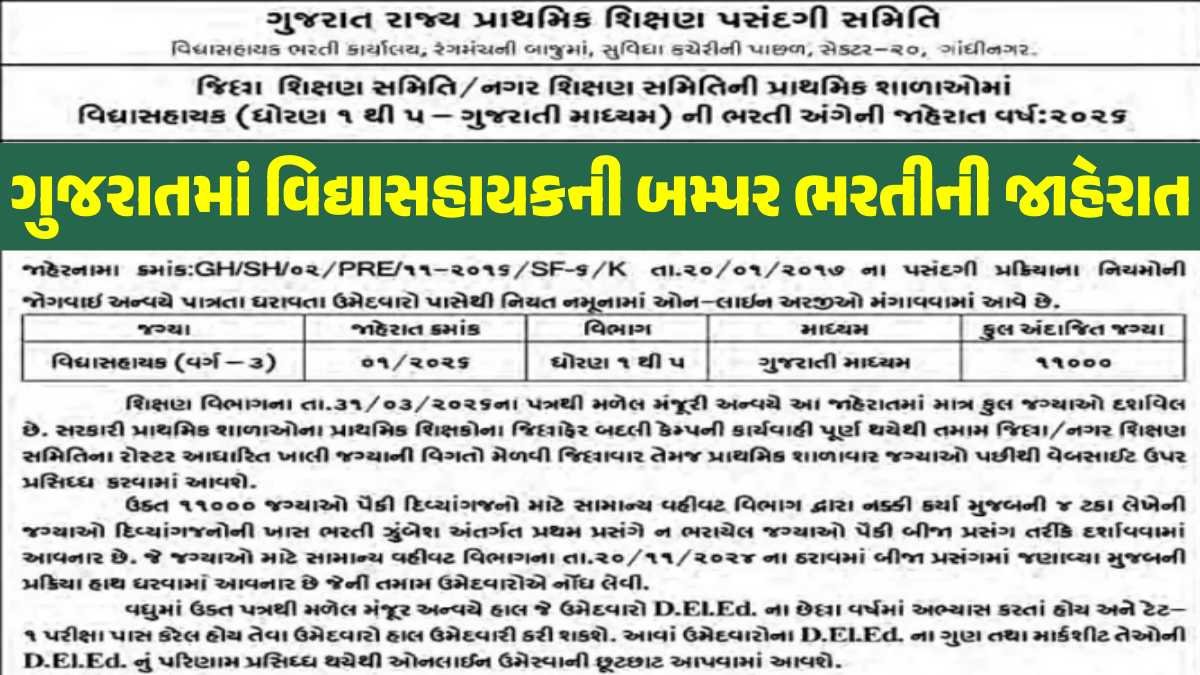 Gujarat Vidhyasahayak Bharti 2026: Std 1 to 5 Gujarati Medium