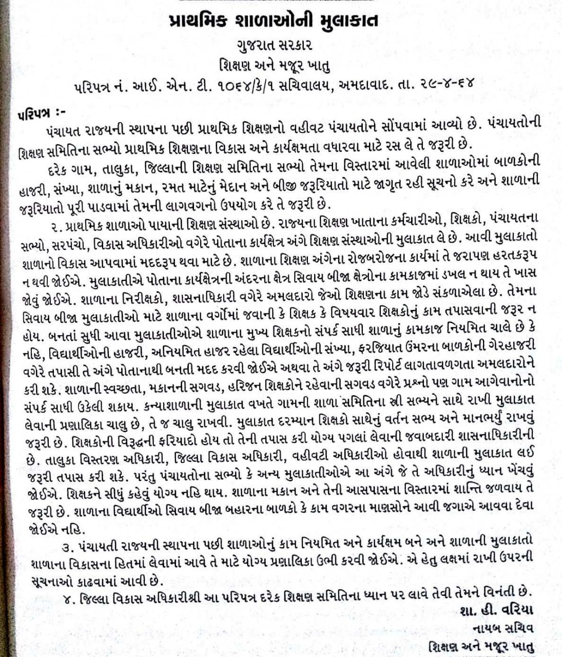 PRATHMIK SHALA MA KON MULAKAT LSI SHAKE TE BABAT MAHATVAPURN LETTER DATE- 29-4-1964.