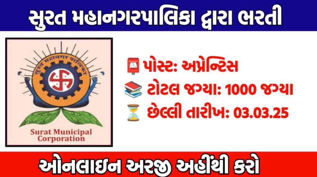Surat Municipal Corporation Recruitment 2025: Surat Municipal Corporation- SMC is recruiting for 1000 Apprentice Trades. SMC Recruitment 2025, you can find other details like age limit, educational qualification, selection process, application fee and how to apply are given below. Surat Municipal Corporation Recruitment 2025 સંસ્થાનું નામ સુરત મ્યુનિસિપલ કોર્પોરેશન- VMC કુલ જગ્યાઓ 1000 પોસ્ટનું નામ … Continue reading Surat Municipal Corporation Recruitment 2025